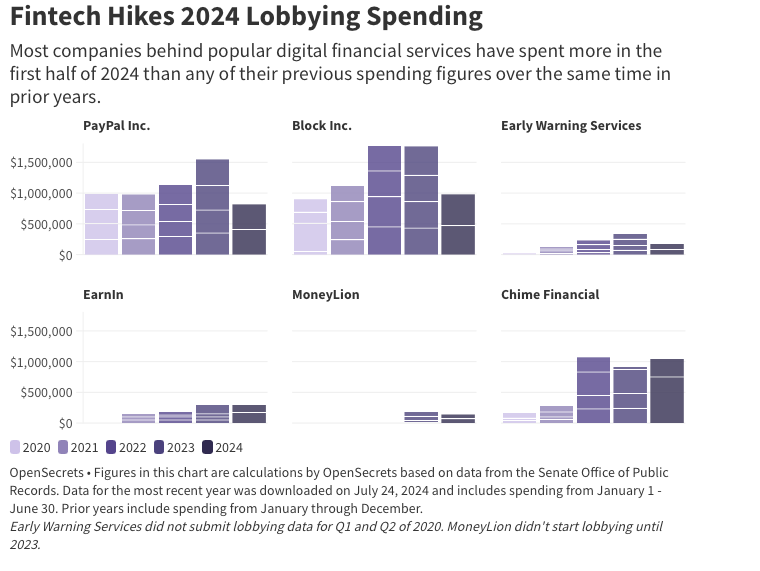 Many companies in the fintech space set new lobbying records in the first two quarters of 2024. From peer-to-peer money transfer apps — apps that let users borrow from their next paycheck — to “neobanks,” lobbying spending is up, and details on why are scant.